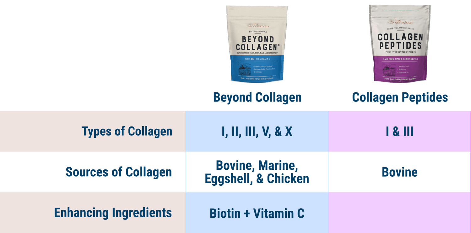 **50 words:** Live Conscious® Beyond Collagen® delivers five types of hydrolyzed collagen (I, II, III, V, X) from four sources to promote skin elasticity, hair and nail strength, and joint mobility. Enhanced with biotin and vitamin C, the unflavored powder mixes easily into any daily beverage for comprehensive structural support.