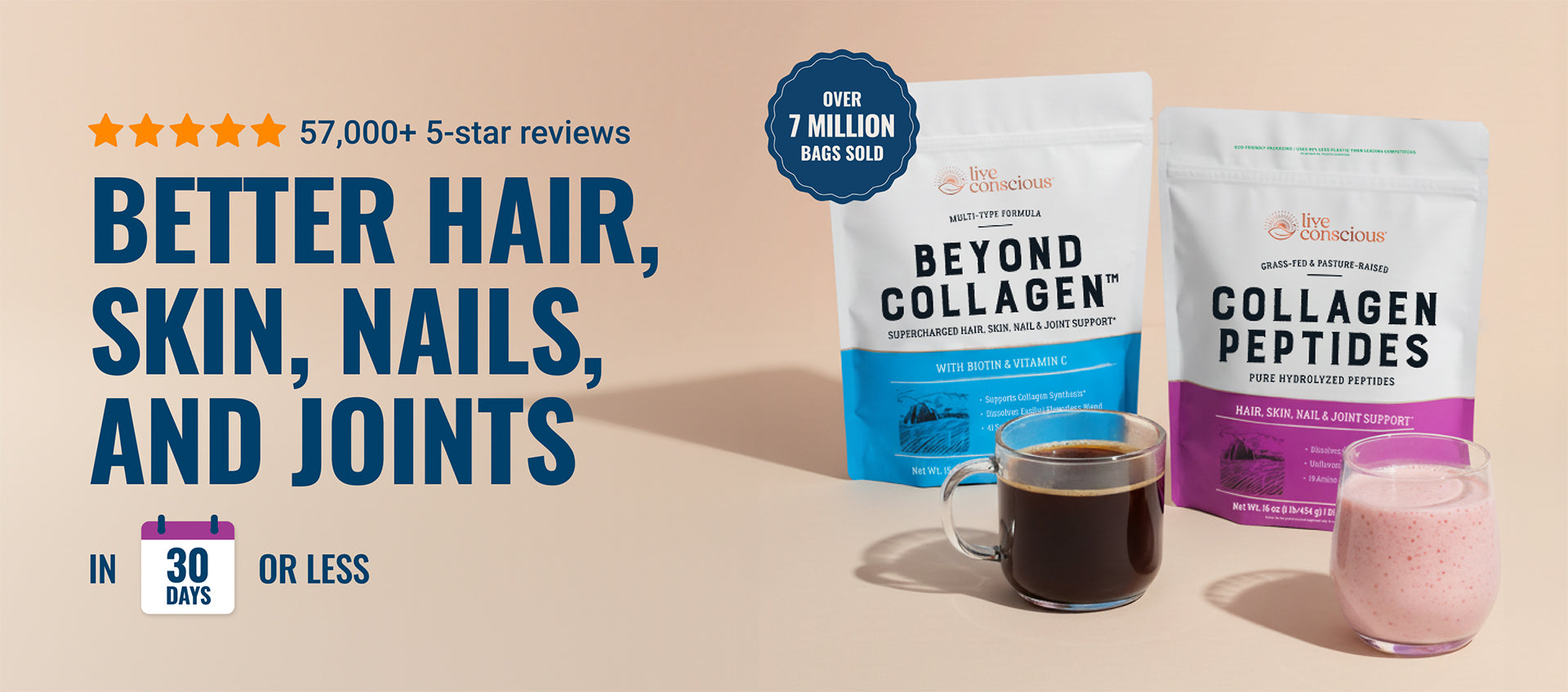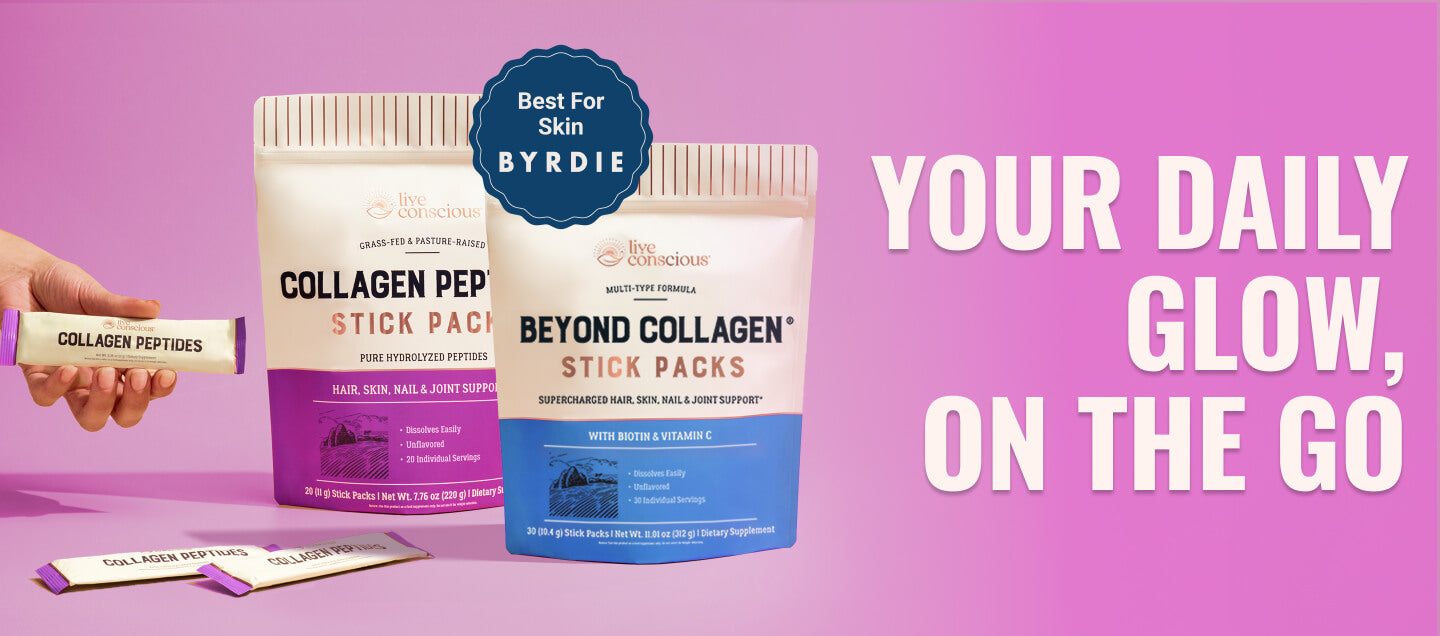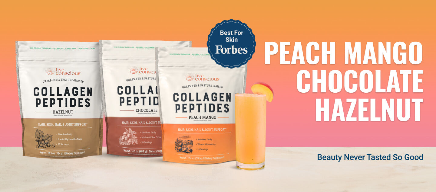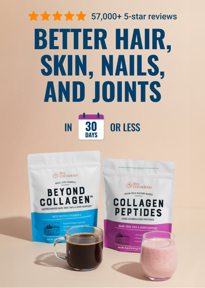 Live Conscious Collagen Peptides delivers types I & III collagen for radiant skin, thicker hair, durable nails, and easier movement.