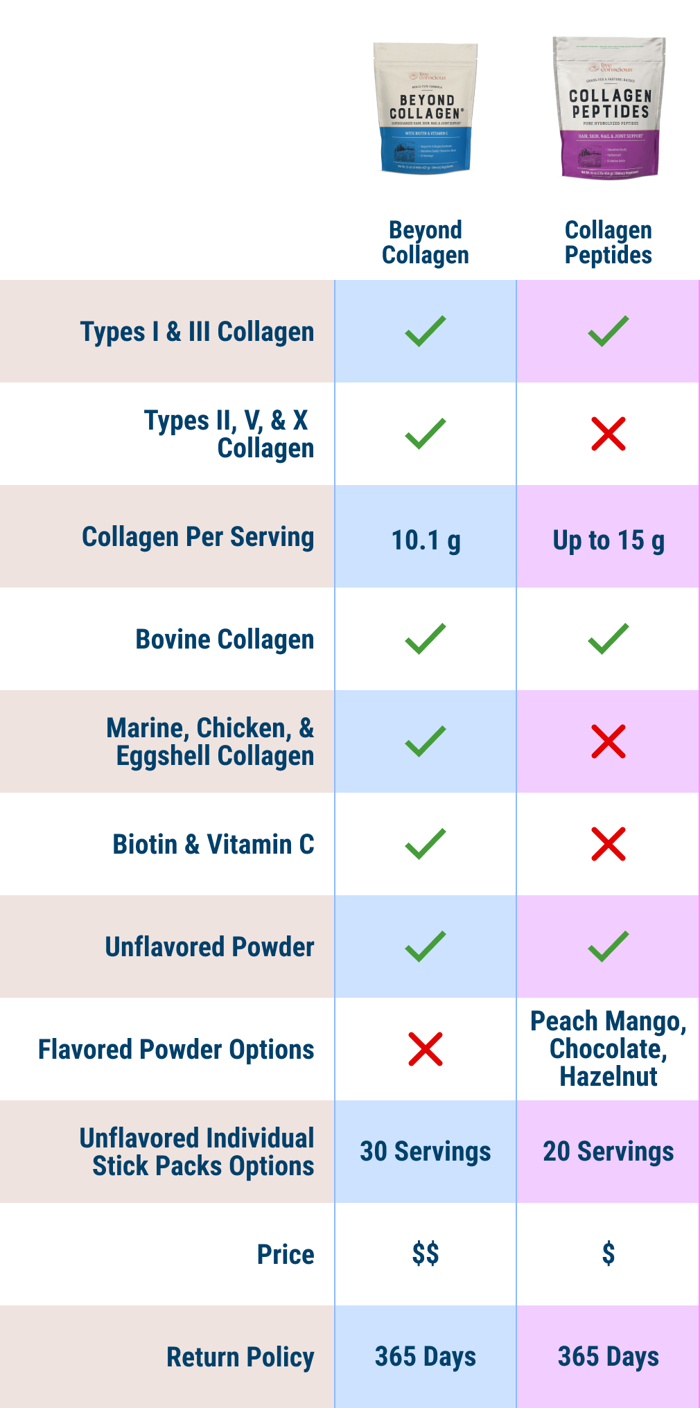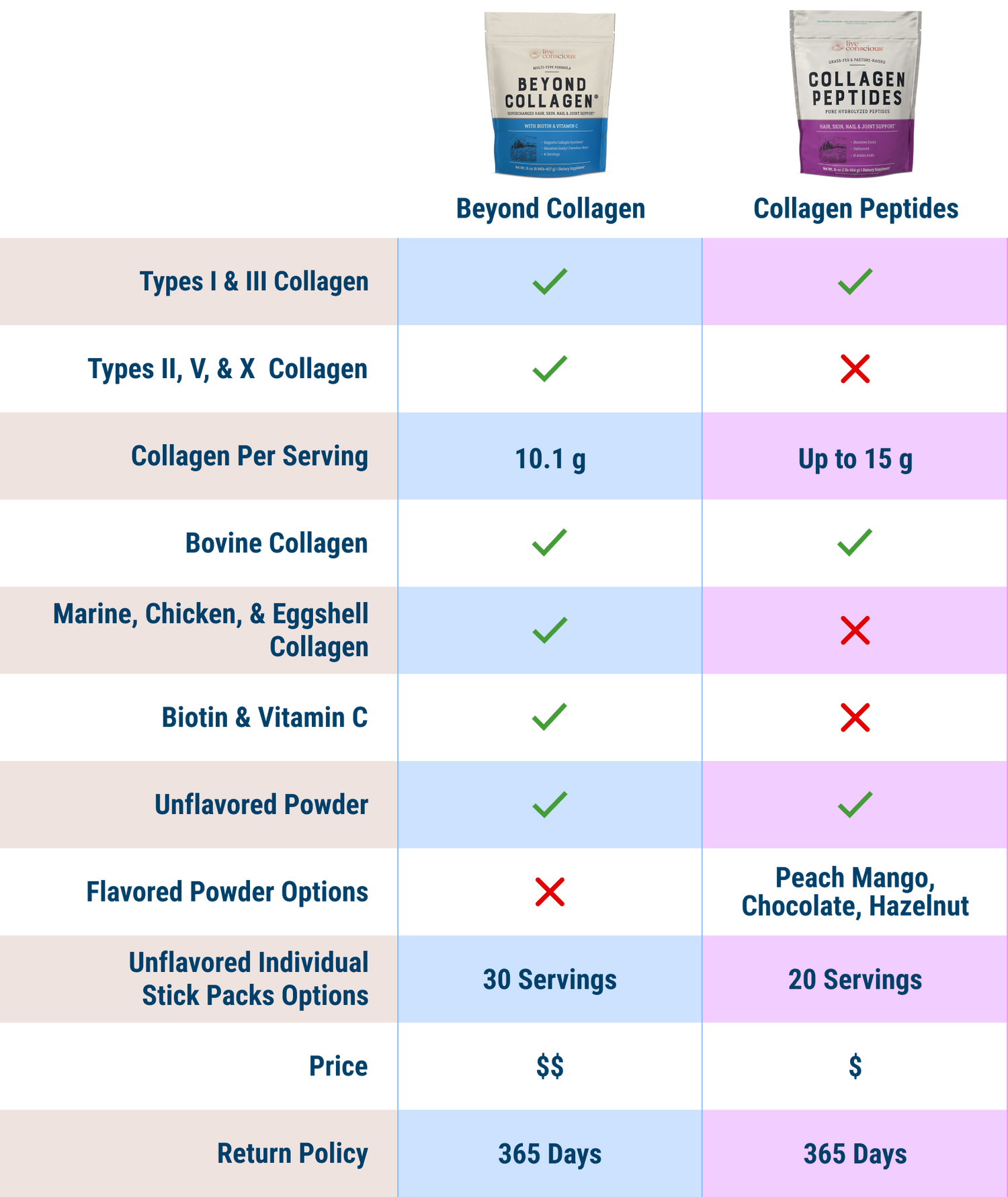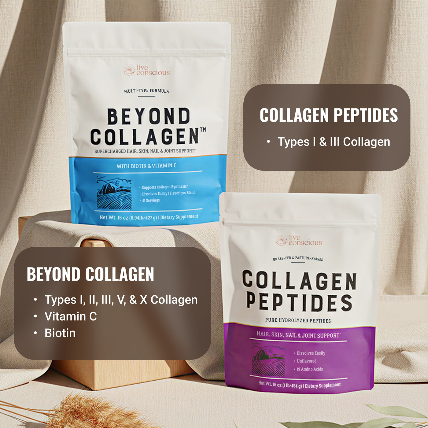 Beyond Collagen goes further with five collagen types, plus biotin and vitamin C, providing a complete transformation for hydration, absorption, and strength.