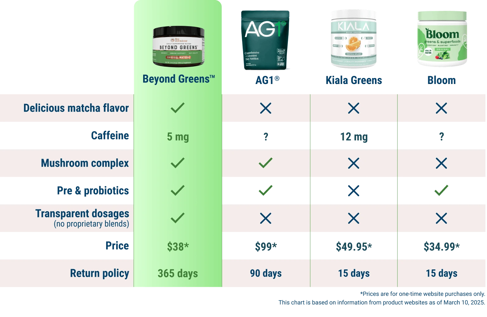 Some people may experience mild digestive discomfort when trying new supplements, including Beyond Greens. If you are sensitive, you may want to begin with a smaller dose and gradually increase to the suggested amount. That being said, Beyond Greens is generally easy to digest with few reported side effects.