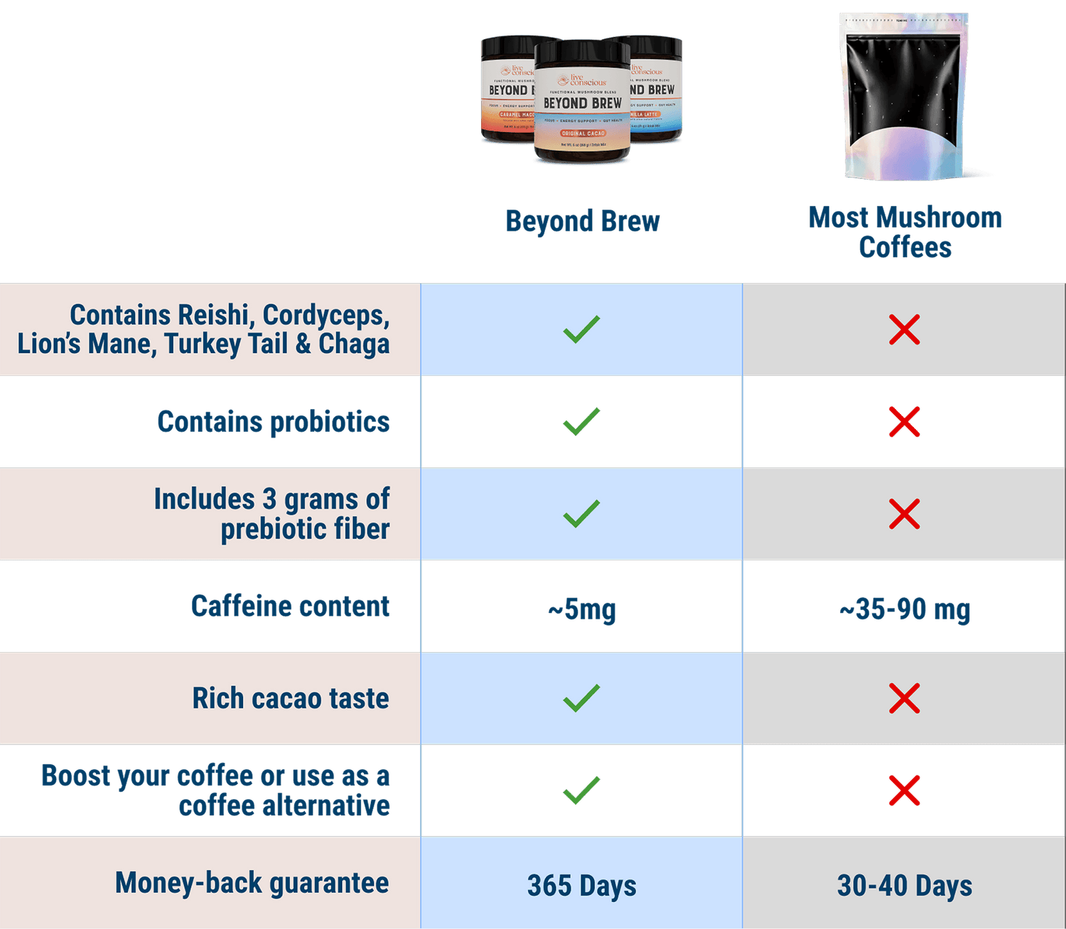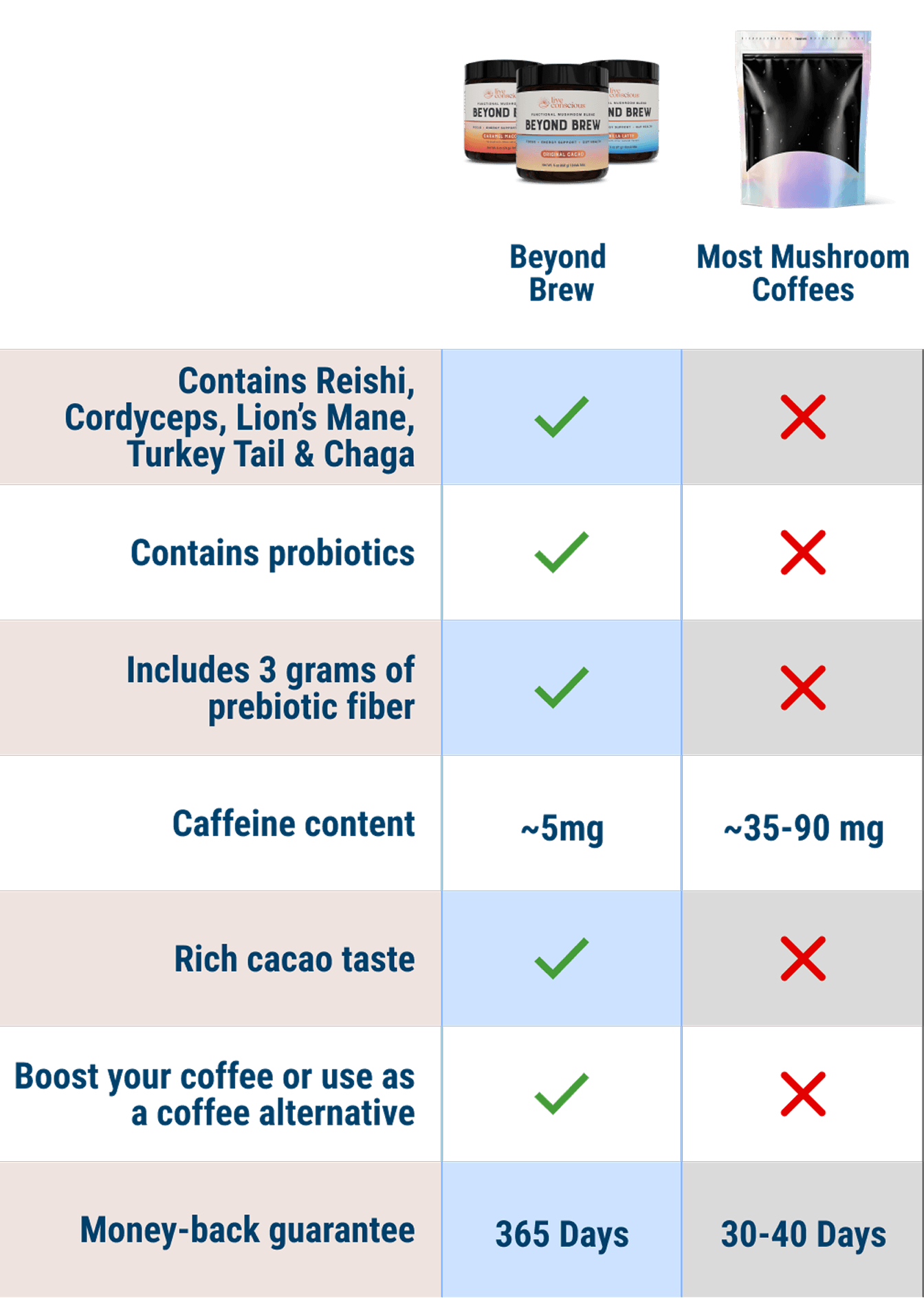 Unlike many mushroom coffees, Beyond Brew is completely coffee-free. And while every formula varies, Beyond Brew stands out with added fiber, pre- and probiotics, a diverse mushroom blend, and three delicious flavors to choose from.