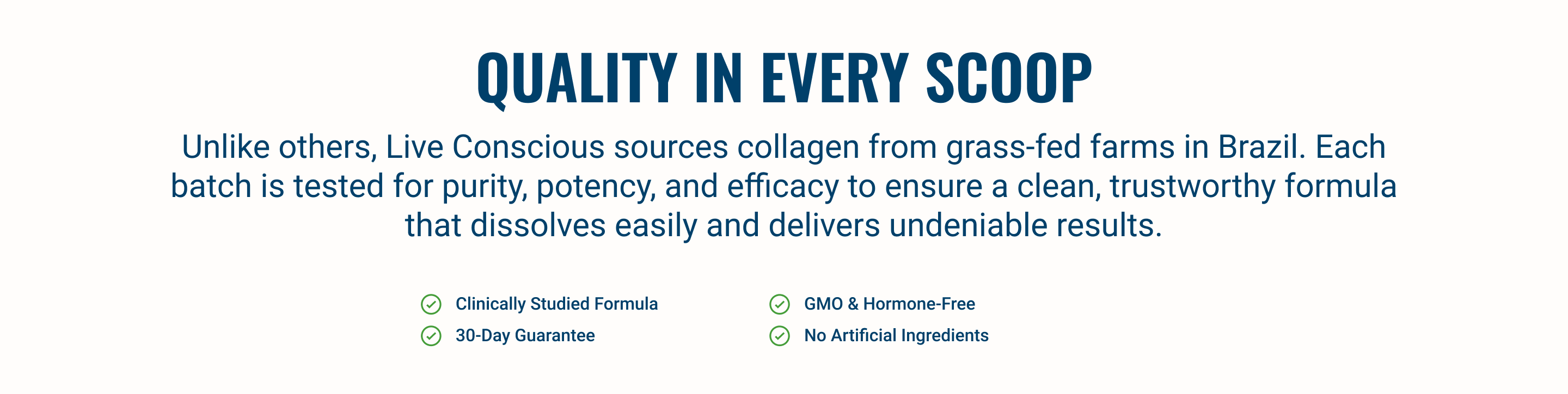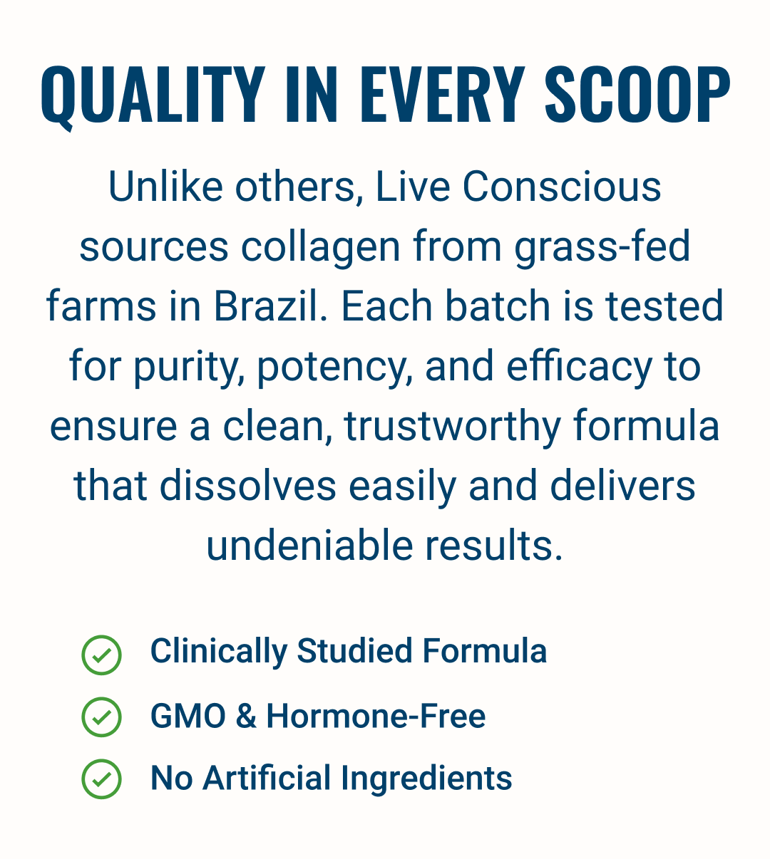 That’s why I trust Live Conscious Beyond Collagen.Their formula is crafted to support your body’s natural collagen foundation with clinically studied types I, II, III, V & X collagen.One scoop a day helps promote smoother skin, fuller hair, stronger nails, and more flexible joints, supporting graceful, healthy aging from the inside out.