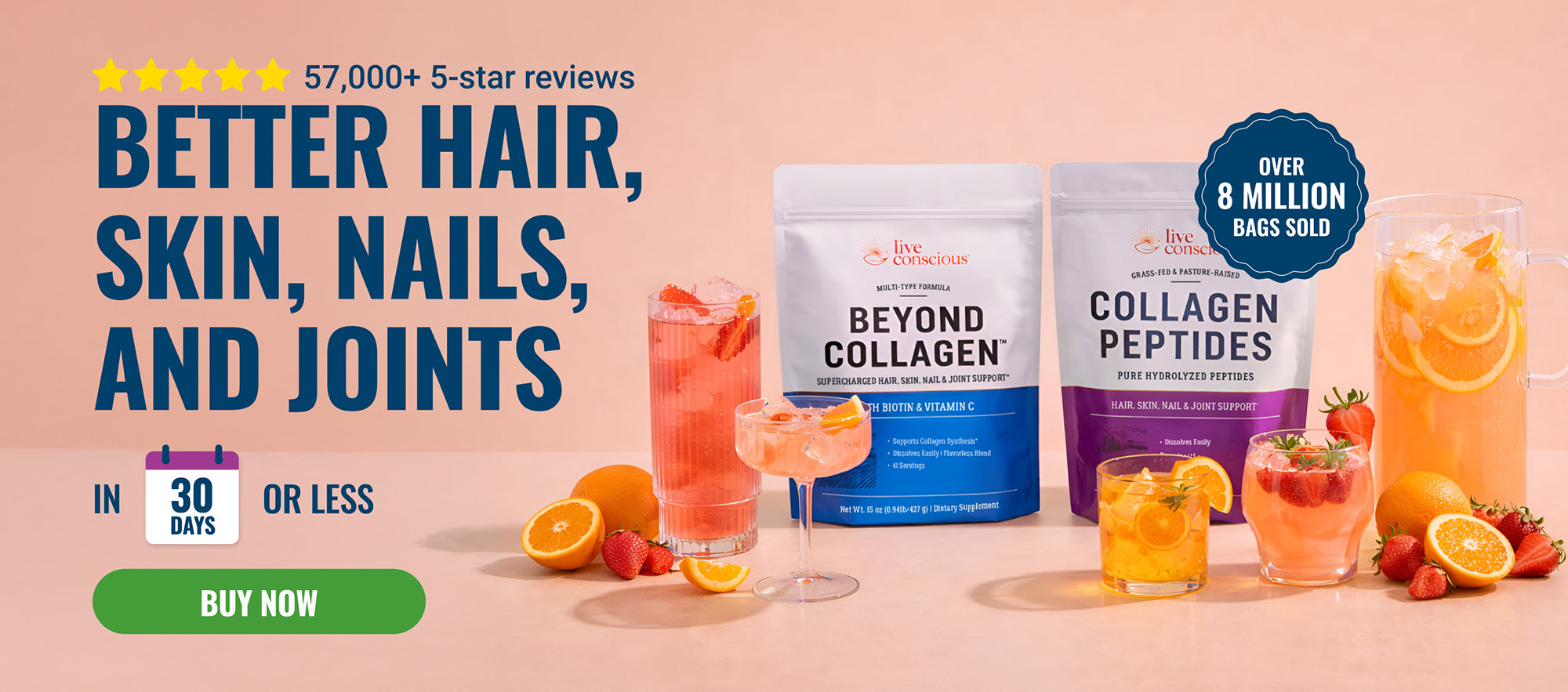 Live Conscious Collagen Peptides delivers types I & III collagen for radiant skin, thicker hair, durable nails, and easier movement.